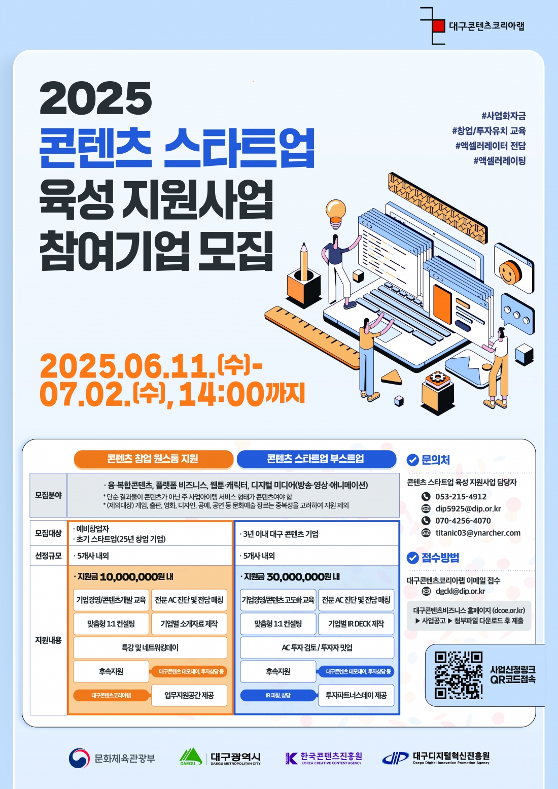 (재)대구디지털혁신진흥원에서 지역 내 우수 콘텐츠 기업 발굴 및 육성을 목적으로 「2025년 대구콘텐츠코리아랩 콘텐츠 스타트업 육성 지원사업」참가기업을 모집 하오니 많은 관심과 참여 바랍니다.