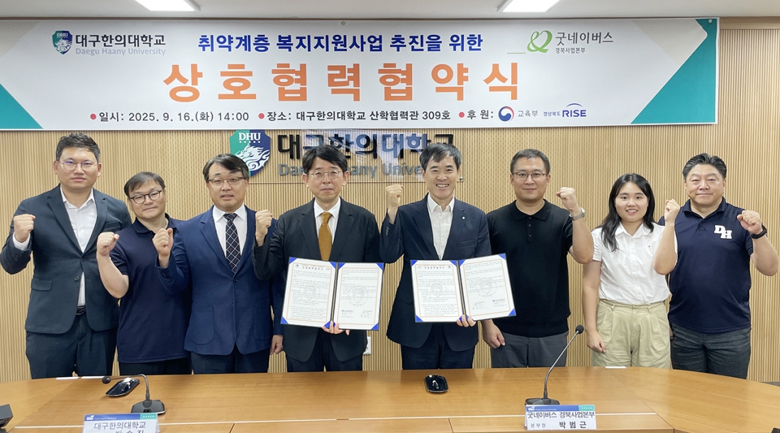 대구한의대학교(총장 변창훈)와 사단법인 인터내셔날 굿네이버스 경북사업본부(본부장 박범근)는 지난 9월 16일(화) 대구한의대학교 산학협력관에서 대학생 역량개발과 취약계층 지원을 위한 상호업무협약을 체결했다.